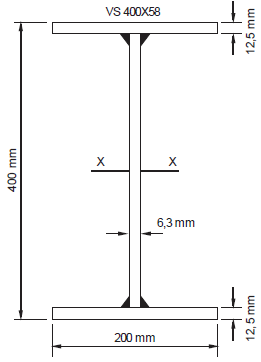 Uma estrutura de aço será projetada, para o estado limite último e para situações de combinações de ações normais, com uma viga biapoiada contida lateralmente com perfil VS400 × 58 em aço MR250, de seção compacta, como ilustrada na figura abaixo.