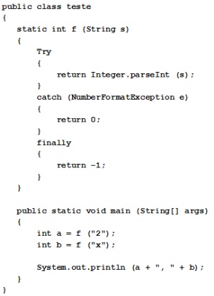 No pequeno programa Java a seguir, considere que o método estático parseInt da classe Integer converte, quando possível, a representação decimal de um inteiro armazenada em uma cadeia de caracteres (string) para a representação binária interna deste inteiro. Quando a conversão não é possível, a exceção NumberFormatException é lançada.