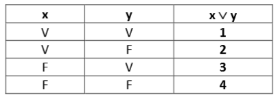 Assinale a alternativa que contém os valores CORRETOS para 1, 2, 3 e 4, considerando-se o Conectivo do tipo OU (x ? y).