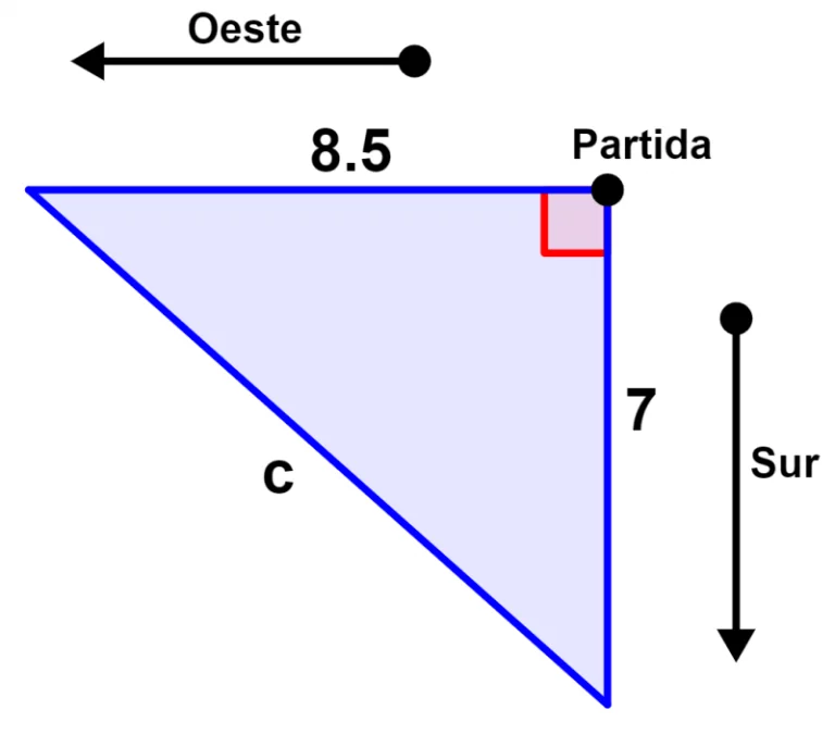 Dois ciclistas saem para passear ao mesmo tempo, um indo para o sul e o outro para o oeste. Depois de meia hora, o ciclista no sentido sul percorreu 7 quilômetros e o ciclista no sentido oeste percorreu 8,5 quilômetros.Nesse momento, qual é a menor distância entre eles? Resolva considerando a imagem abaixo: