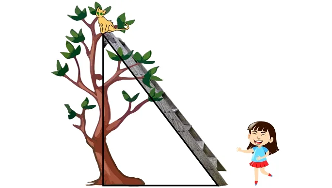 Carla ao procurar seu gatinho o avistou em cima de uma árvore. Ela então pediu ajuda a sua mãe e colocaram uma escada junto à árvore para ajudar o gato a descer.